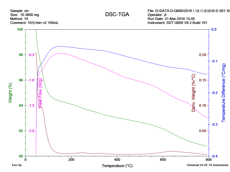 急求解析!!这是小弟做的一个热重图,催化剂为Cu/SiO2,氮气环境下,10℃-800℃,出现了如图的现象,小弟不明白的是:在200℃之前,即失水阶段,对应的热流曲线为放热,而不是吸热呢???求解 fresh.png |