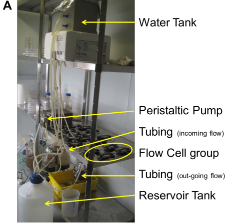 现在想在实验室培养自然水体中的生物膜,不知道怎么培养,用什么装置?多长时间?怎样才能挂膜成功?看到一篇文献Heterotrophic biofilms were cultivated in flow cells (for dimensions and experimental set up please see SI Figure 2) at 15 °C with a constant water flow (flow rate = 2 cm s−1) over a membrane support (Regenerated cellulose acetate, PM UC030, Microdyn Nadir, Wiesbaden, Germany).不太懂有懂得没,小弟是初次接触这方面多谢指教呀。 还有文献的一个实验装置谁能详细解释下吗,衷心感谢。 $MGKE~J`6X8LN]F(KWQK(AX.png )KRO_3J(MYOZ1FU%BE(KDP8.png@zslddt |
