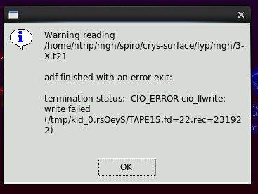 请教各位大牛,用ADF算载流子迁移率算二个分子摆成的二聚体的分子时正常结束,算三个分子摆成的多聚体时,将每个分子分成一个区进行计算,报错如下,请问什么意思啊?该怎么解决。感谢~! 1.jpg 2.jpg |