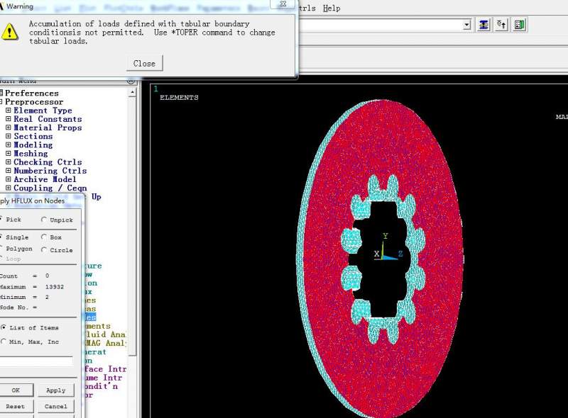 对制动盘摩擦面施加热流密度和对流换热系数两种热载荷,对流换热系数已经施加在表面效应单元,对实体节点施加热流密度时出现以下提示错误,求大神解答!急急急!