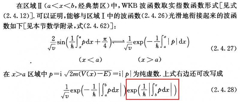 大家好!我想向大家请教一个问题,是曾谨言《量子力学》中2.4.3势垒遂穿一节中的一个公式理解。 我有问题的部分如下图所示: 我的问题是红框内指数项不应该有个负号么?如果没有的话,请问这个公式是怎么得到的? 谢谢帮助! 书中的2.4.3一节附在附件里。 |