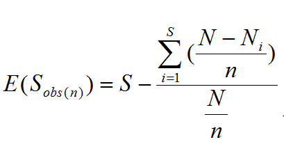 红外相机监测日与物种间的稀疏化 ; S为总监测日内出现的物种总数,N为总监测日,Ni为第i个物种出现的总的监测日,n为随机抽取的监测日(1到总监测日间)。 通过以上公式计算,不论n怎么变 ,结果不变。得出结果E应该为物种数,E应该随着n的变化而变化,为什么会不变呢,求各路大神解答。。。。请问我对公式的理解是否有误?或者公式是否有误? 360反馈意见截图16290613676995.png |