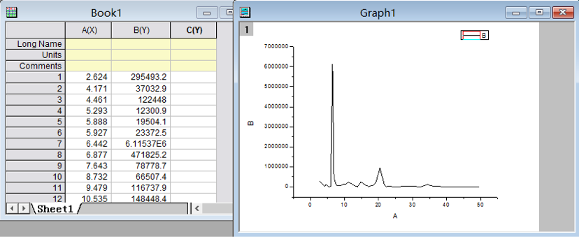 | 各位大神,请问一下已知气相色谱的保留时间和峰面积、峰高数据,如何用origin做出一样的图,我试着拿保留时间和峰面积分别作为横、纵坐标,做出来的图完全不对,请问是怎么回事 |
