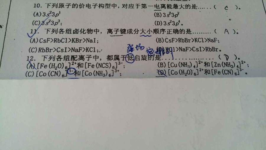 应该选c,氰根是强场配体,所以形成内轨型配合与,氨根对于三价的钴是强场,对于其他离子是弱场配体 发自小木虫IOS客户端 |