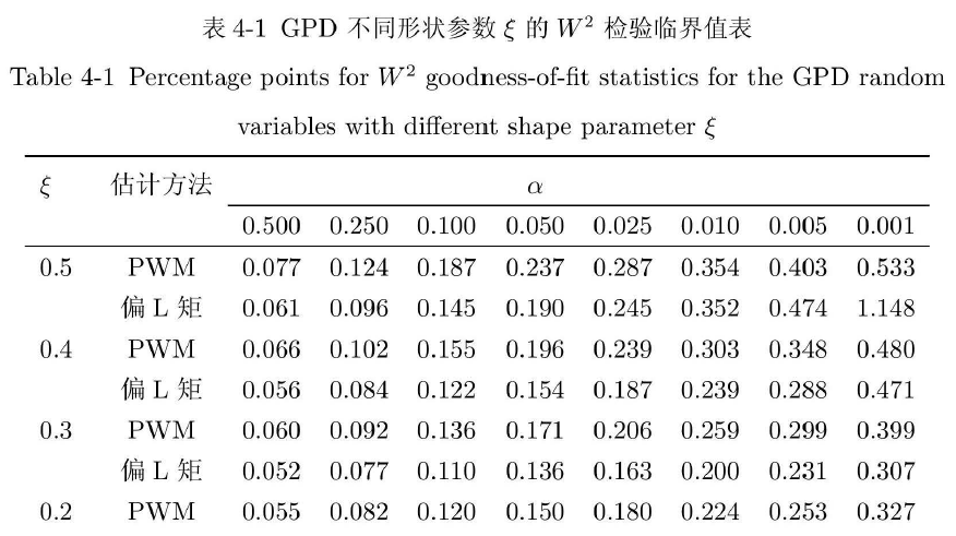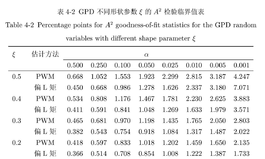 在利用Cramér-von Mises 统计量W2 和Anderson- Darling 统计量A2进行GPD分布拟合优度检验的时候,首先需要产生一个如下图所示的临界值表,以便后续进行拟合优度检验。