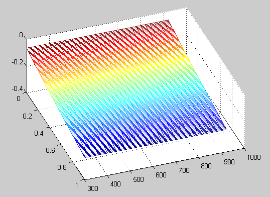 T定义为1 T=1; xa=0:0.01:1; ya=300:20:920; [x,y] = meshgrid(xa,ya); z=((5*y+3.191)./(0.354*y+1.17*x.*y+5*T+3.191))-1; figure(1);mesh(x,y,z); figure(2);surf(x,y,z); |