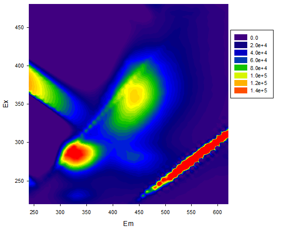三维荧光,初步接触不甚了解。通常看他们有两个杂峰。为啥我只能画出一个,而且一面没有数据。用别的软件画,还有负峰(负值)出现,通常在没有数据的地方出现。