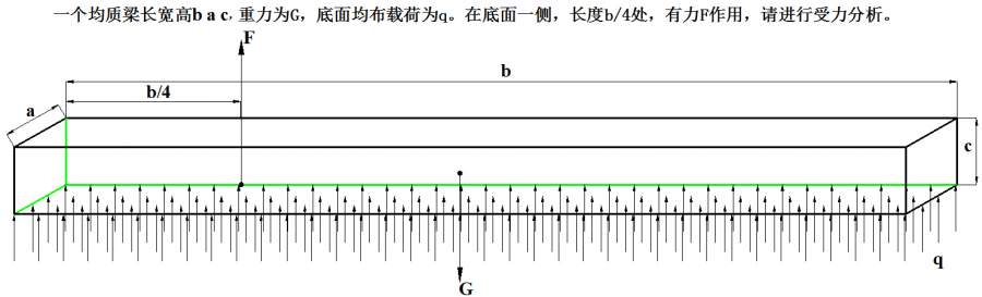 一个均质梁长宽高b a c,重力为G,底面均布载荷为q。在底面一侧,长度b/4处,有力F作用,请进行受力分析。剪力 弯矩 扭矩 三项。谢谢
