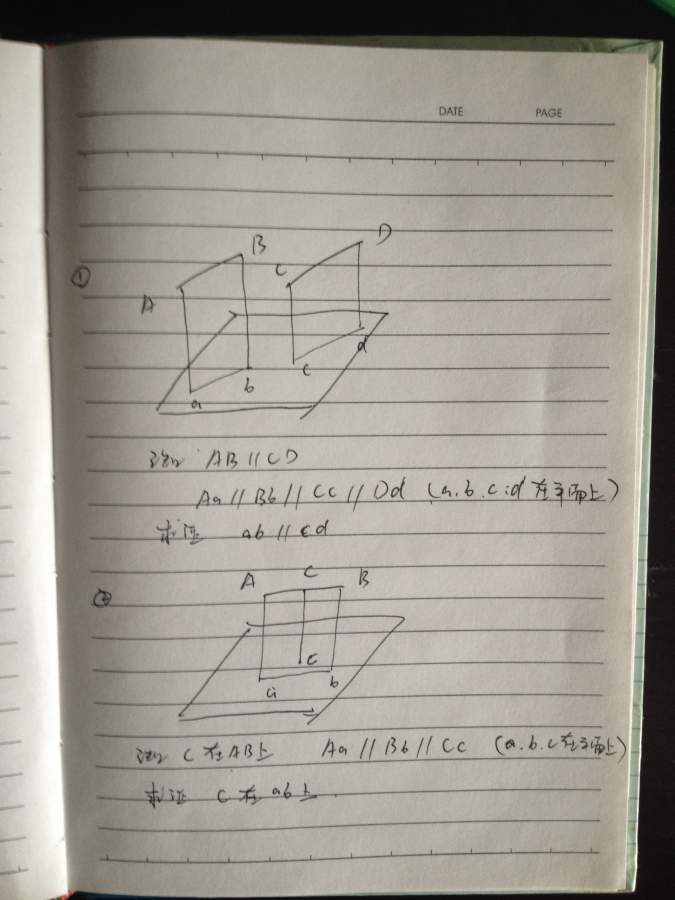 第一题,即证明用一个平面对一个四棱柱上做任意方向的截面所得的两个不相邻的边是平行的。第二题,两个相交平面所得的交线与在任意两平面上的平行线上的点距离相等 发自小木虫Android客户端 |