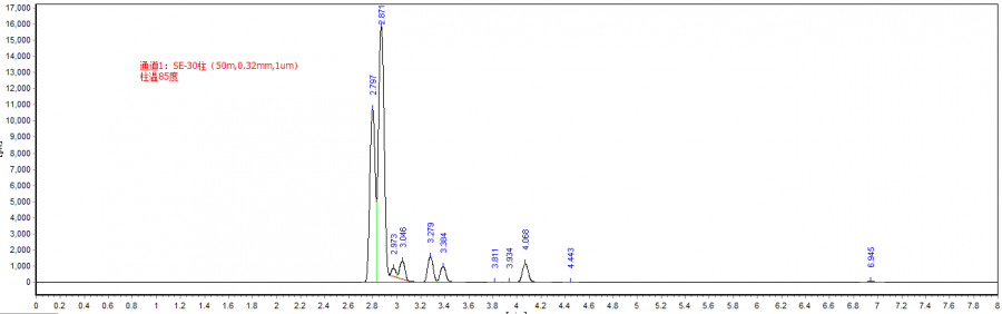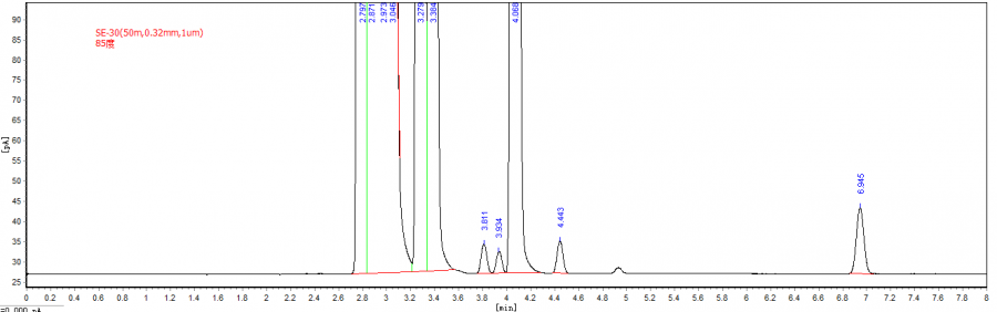 进样为烃类的标气(具体组成见下图),色谱柱为SE-30毛细柱(50m,0.32mm,1um),柱温85度保持9min,FID检测器 进样气组成: 下图是出峰的图谱 下面是上一张图放大的图谱 现在有点不知道哪个峰对应哪种物质? 大神们能不能帮忙看看,感谢! |