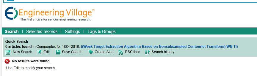 0 articles found in Compendex & GEOBASE for 1884-2016: ((Weak Target Extraction Algorithm Based on Nonsubsampled Contourlet Transform) WN KY) EI,按照你的标题检索,我是暂未检索到啊 |