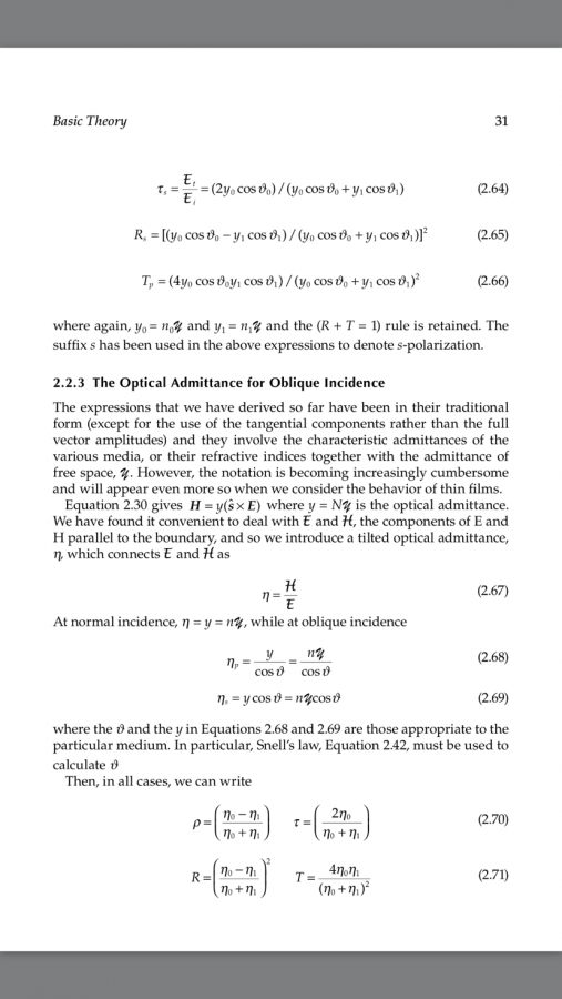 斜向入射时,等效导纳与垂直入射时不同,相厚度也有差异,计算出来的反射比和透射比不同。另外斜向入射时还要考虑偏振,区分p光和s光,具体可找干涉相关的书看一下推导就理解了。 发自小木虫IOS客户端 |