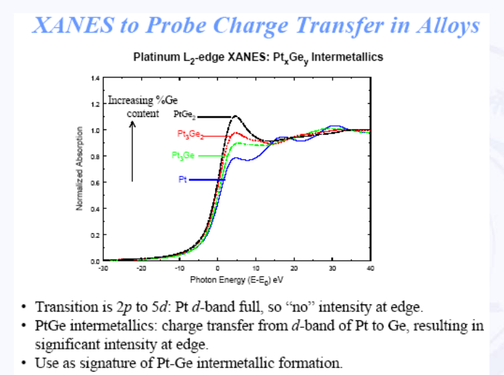 从XANES的探测原理解释,XANES测定的是电子空态密度的,对贵金属,主要测d电子,d电子空位越多,白线峰越强。双金属颗粒(例如PtGe),随着Ge含量的增加,Pt的d电子转移到Ge上的量增加,也就是Pt的d带电子空态增加,则白线强度也就增大了。。。 发自小木虫Android客户端 |