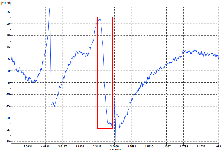 有做过EPR的大神,能告知图片中红色方框里是哪种过度金属,或者其它物质所呈现的峰? 已有1人参与