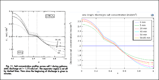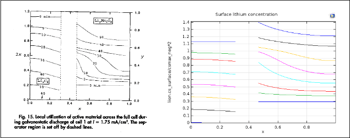 我想把文献中的结果用Comsol Multiphysics仿真出来。固相当中锂的电势与浓度分布像是那么一回事,但是液相中锂离子的浓度与电势分布却得不到。