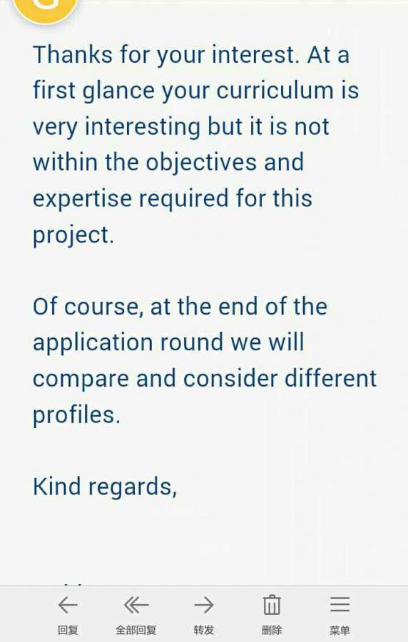 申请了一个欧洲博士职位,负责的教授是这么回复我的,不知道这种情况还有戏吗?该怎样增加录取几率呢?谢谢大家了。 发自小木虫Android客户端 |