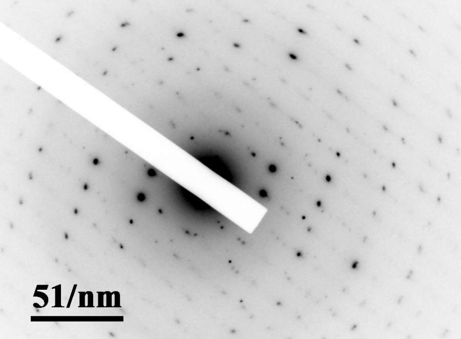 该物质是层片状的三元单斜金属氧化物,实在是不知道怎么标定,所以来求助一下。 想问问大神们这是层片状造成的还是因为是孪晶。 衍射花样.jpg@Monash2011 |