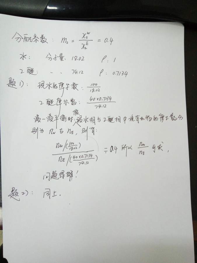 20℃某有机酸在水和乙醚中的分配系数为0.4。今有该有机酸5g溶于100cm3水中形成的溶液。(1)若用40cm3乙醚一次萃取(所用乙醚已事先被水饱和,因此萃取时不会有水溶于乙醚),求水中还剩下多少有机酸?(2)将40cm3乙醚分为两份,每次用20cm3乙醚萃取,连续萃取两次,问水中还剩下多少有机酸? 这道题,我有点不太明白题意,就是读了题目,不知道该如何做,没有想法,,求物化强人提供一下具体的解析思路和想法 |