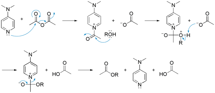 DMAP的吡啶氮原子进攻乙酸酐亲电的羰基碳,形成1-乙酰基-4-二甲氨基吡啶盐,其中乙酰基二甲氨基吡啶盐正离子与乙酸根离子形成一个不 紧密的离子对。醇的氧原子亲核进攻与吡啶相连的乙酰基碳原子,而后第一步产生的乙酸根离子立即夺取醇的氢,然后氧负把吡啶挤出去,产生酯,同时重新生成 DMAP催化剂,进行下一个循环。DMAP的催化效果比类似的吡啶要强很多的原因,主要有以下几点: DMAP中的二甲氨基有给电子效应,强烈地增加了吡啶环上的电子密度,使吡啶环氮原子的碱性和亲核性增强。 第一步形成的酰基-4-二甲氨基吡啶盐分子中心电荷分散,形成一个连接不紧密的离子对,酸碱催化下有利于亲核试剂向活化的酰基进行进攻。 酰基-4-二甲氨基吡啶盐正离子由于取代基的缘故,可以因共振效应而得到稳定。 |