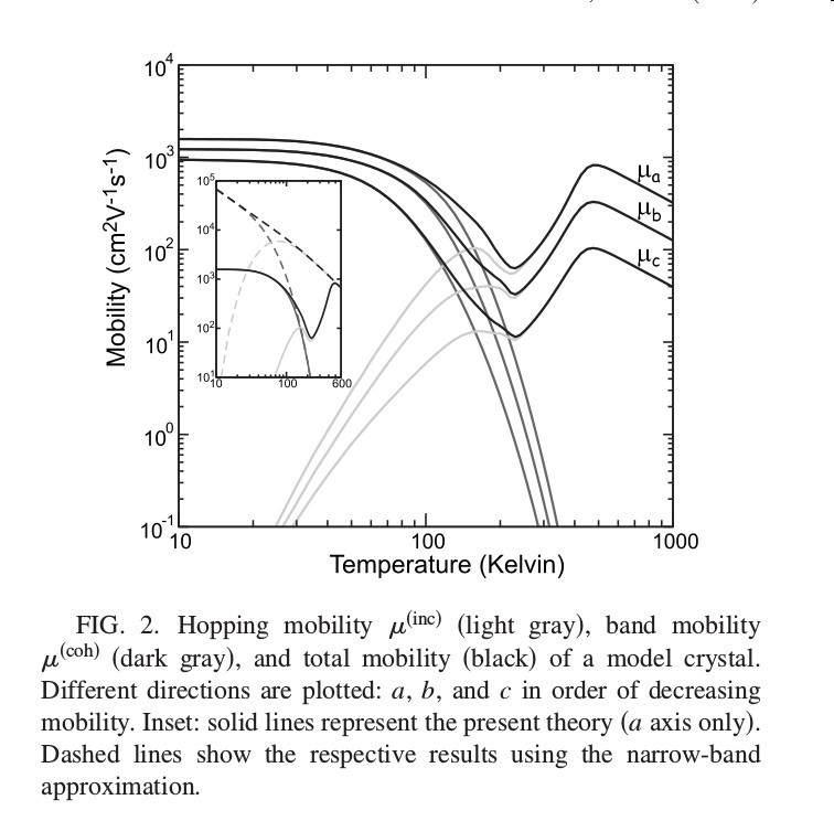 附件的图 [3] 描述的是hopping mechanism和band mechanism对mobility的贡献随温度的变化情况.可以看出,在低温(100 K - 200 K)下,band mechanism的作用强.高温是hoping mechanism占主导.