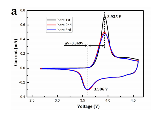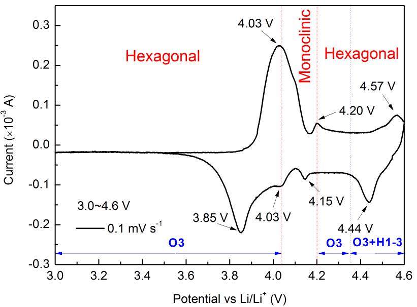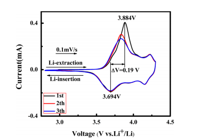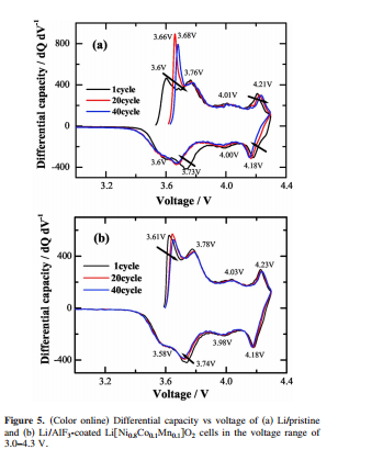 | 个人理解:在层状盐岩化合五中,从能级分布上来看:按照费米能级分布从高到低:Ni2+/Ni3+,Ni3+/Ni+,Co3+/Co4+;也就是说在电池中对应先发生氧化还原的顺序应该是Ni2+/Ni3+,Ni3+/Ni+,Co3+/Co4+,而对应的电池电压平台逐渐升高。通过CV扫面的峰值也应该遵循上述原则,但是实际情况是,上述三个能级是有部分是重叠的,也就是说,会存在有峰重叠的情况,所以在CV中不能明显区分出来。 |