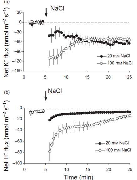 图注:玉米根部中柱对20 mM和100 mM NaCl反应的K+和H+流速的动力学,负值表示外流。