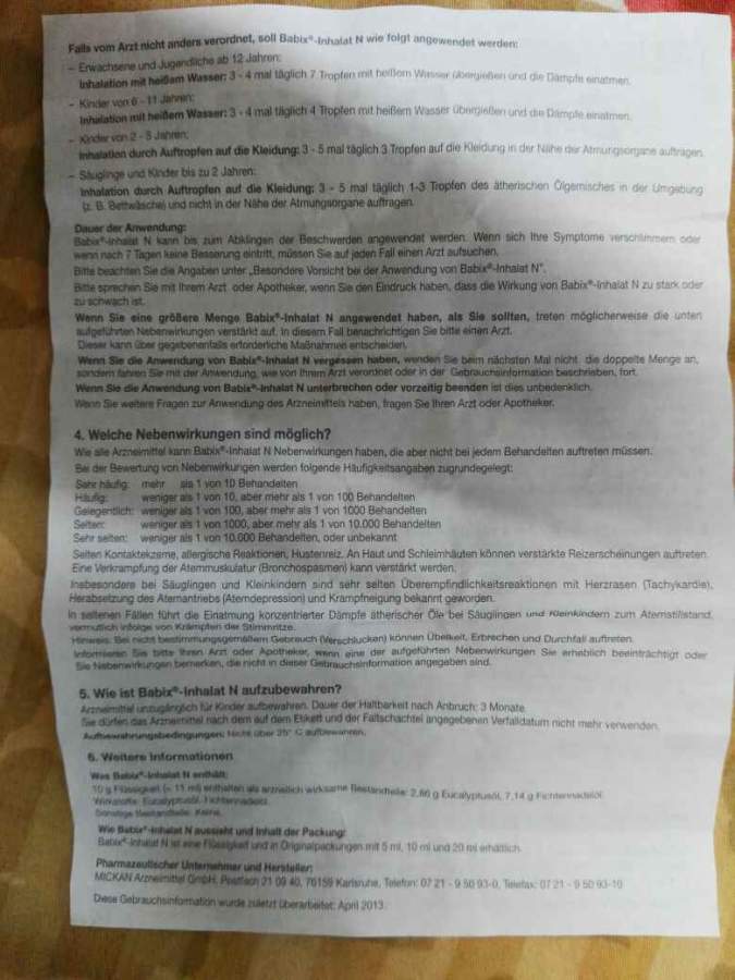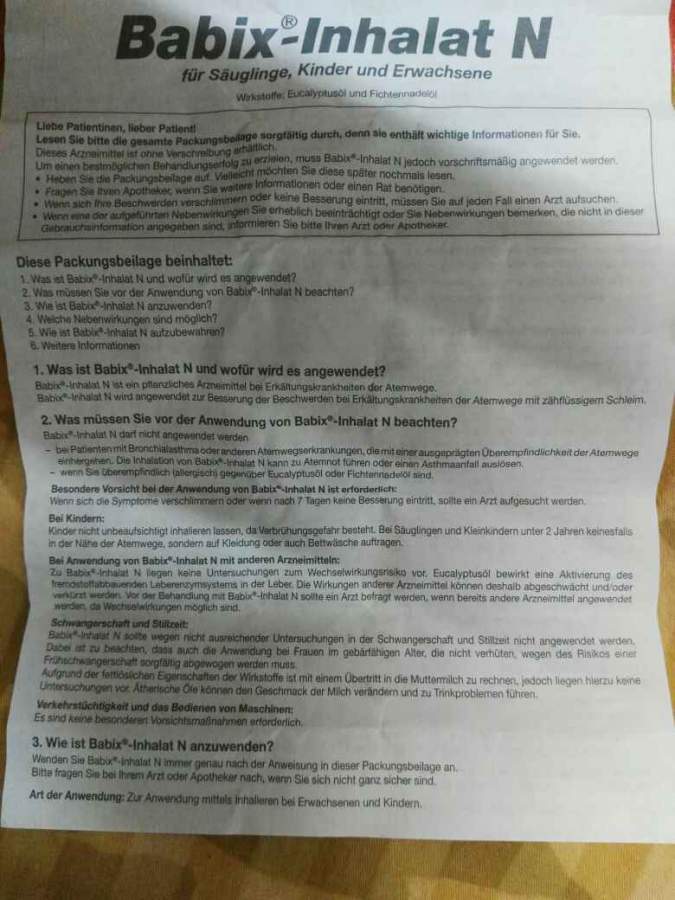 这是BABIX Inhalat N 婴幼儿防感冒鼻塞油(德文,德国制造) 大概意思是: 成分:含28.6%桉树油和71.4%云杉精油成分, 婴儿,儿童,成年人,哺乳期妇女也可以使用。 用法:Babix滴鼻剂是通过100%纯天然有机桉树油和云杉精油挥发的原理,不滴在宝贝鼻腔,而是滴在衣服、枕头上,非常安全舒适,宝贝可以安睡整晚; 适用于宝宝因感冒引起的鼻塞,呼吸困难等。 用量:针对婴儿的话,每天3-4次,每次2-3滴。 情况严重的话,建议每3到4小时使用一次能够有效的缓解宝宝鼻塞呼吸困难。 其他内容,图片不是很清晰,希望对你有帮助 |