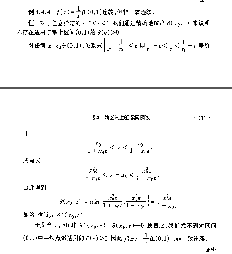 page 114,例题是要证明1/x在(0,1)上非一致连续 证明见图。 我有一个疑问,一开始我是这样证明的: |1/x'-1/x"|=|x'-x"|/|x'x"|<ε,取δ=ε|x'x"|,完全没问题,因为x在(0,1)上,δ肯定是正的,不能是0. 教材说δ->0,所以不成立,但是趋向0永远取不到0。 这个例题到底怎么理解 3.png |