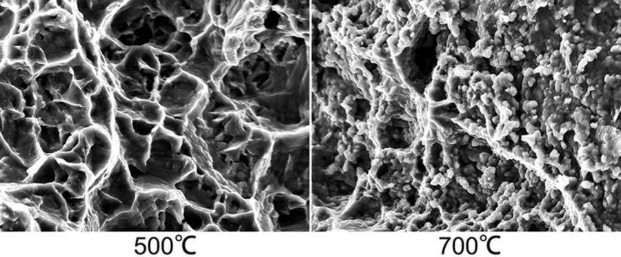 图为TC4(Ti-6Al-4v)钛合金在500℃和700℃的高温拉伸断口形貌,在500℃时断口中的韧窝为普通的形貌特征,然而在700℃测试试样的断口出现了大量颗粒状的形貌特征。求问对700℃时断口中颗粒形貌特征产生的原因。 询问.jpg |