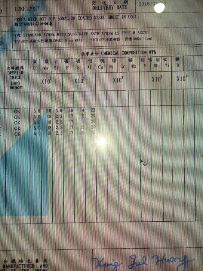 朋友的一个镀55%铝锌彩涂钢卷的分析数据,我看不懂,但是感觉碳含量和硫、磷似乎都有些高,请专业人士帮着看一下啊,非常感谢。