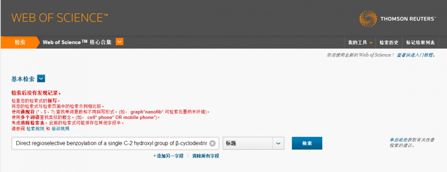 | 求助:文章Direct regioselective benzoylation of a single C-2 hydroxyl group of β-cyclodextrin and its hydrolysis via benzoyl group migration,在web of science的收录页面。 |