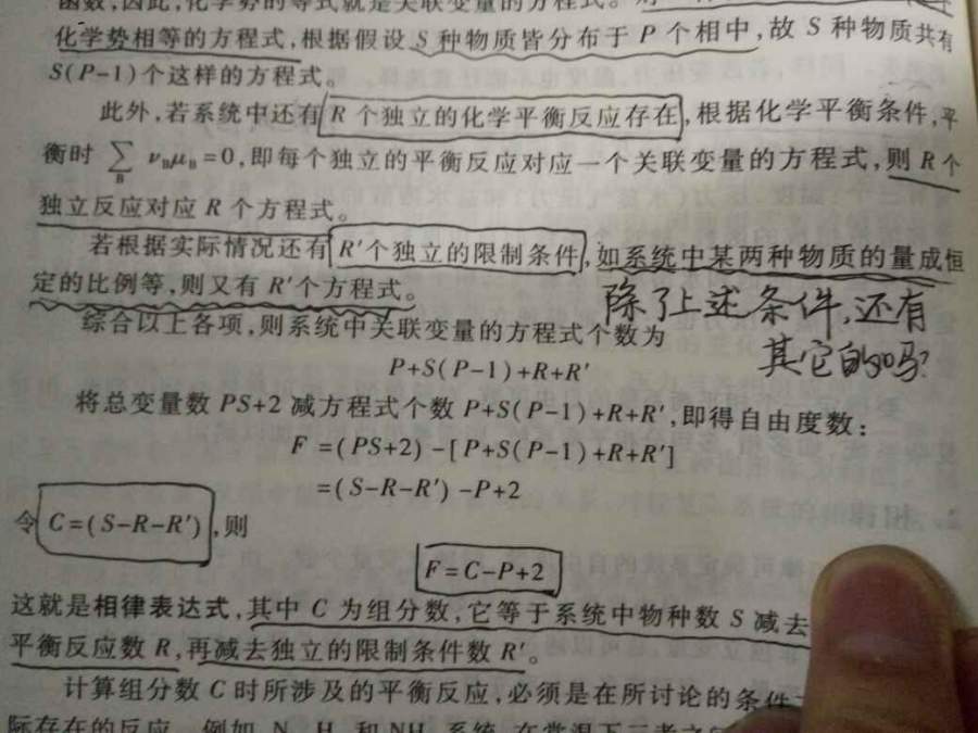 组分数C=S-R-R'中,R'是独立限制条件,天津大学物理化学书上对R'举的例子是"两种物质的量成恒定比例",我想弄清楚,除了两种物质的量成恒定比例或者浓度限制条件以外,还有没有其他独立限制条件? 发自小木虫Android客户端 |