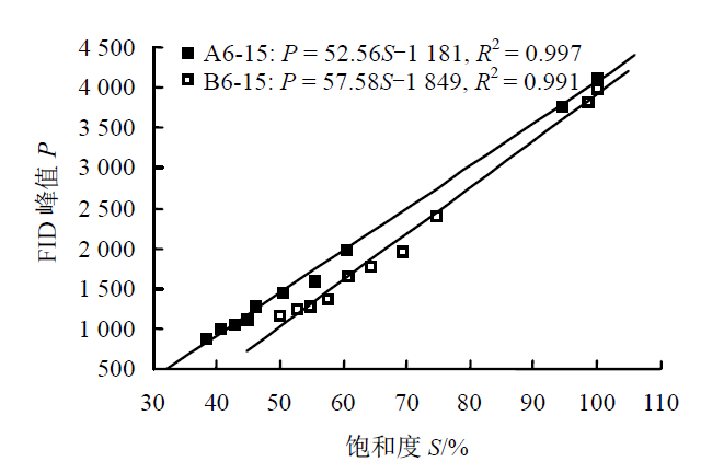 下面将基于试样的T2 时间分布曲线,从各级吸力下试样中水分分布的角 度展开讨论。为了验证基于核磁共振测量的试样水分含量的精度,这里首先给出了A6-15 和B8-15 试样FID 峰值点P 与试样饱和度S 的线性拟合结果(如下图所示)。