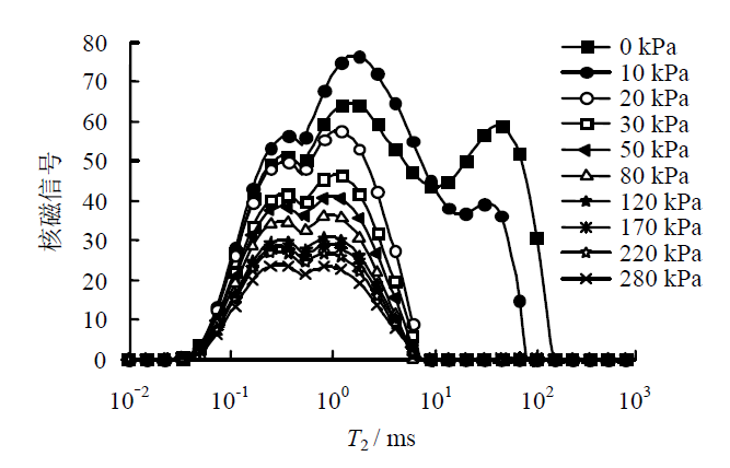 核磁共振(NMR)技术是一种研究单位体积材料中质子(即氢核)含量与分布的无损探测技术。 核磁共振技术通过利用位于一个均匀磁场(主磁场)中具有自旋磁矩的质子群在干扰射频磁场的作用下发生偏转、失去平衡、当射频干扰停止后质子群从非平衡态恢复到平衡状态这一过程,测定核磁信号自由衰减(即FID)曲线。由于FID 曲线上的第1个点(即峰值点)与试样所含质子数成正比,因此,FID 峰值点可用于测定土样含水率。目前已有大量试验证实了此方法的可行性及精度。同时,FID 曲线的形状与质子横向弛豫时间( T2 )有关,T2能反映质子周围的物理化学环境。通过傅里叶转换,可以得到土样中孔隙水的2T时间分布曲线,该分布曲线下方的峰面积代表对应T2 范围内的核磁信号,也即含水率。假设材料满足快速扩散的条件,则土体中孔隙水的T2 值与其所处的土体内 部孔隙结构直接相关.