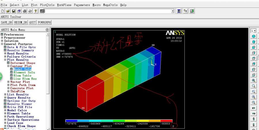 这是一个悬臂梁模型,左端为固定端,为什么DMX=736880>SMN的绝对值727675,smn数值最小,但绝对值应该是最大的,还有DMX为什么不是负数? 360截图20160426100712077.jpg |