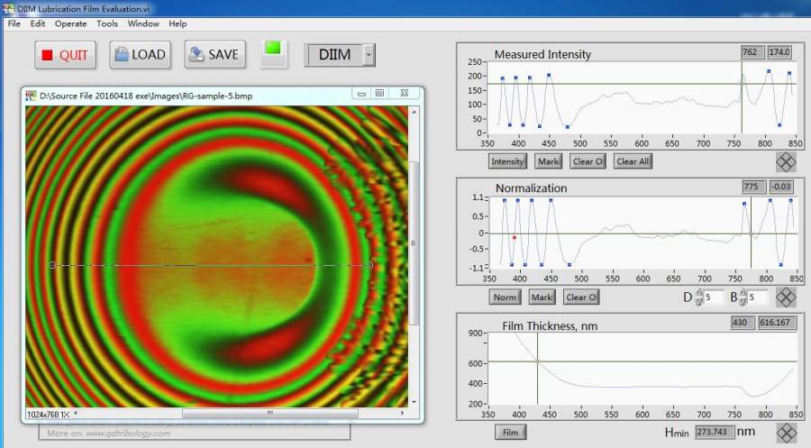 学位论文【青岛理工大学摩擦学研究所】-双波长润滑油膜厚度的光干涉测量方法 DIIM微纳米润滑油膜厚度测量方法---避免了单色光干涉级次计数;高效大量程测量 研究生:刘海超 导师:郭峰教授 More:http://www.qdtribology.com/ DIIM Software.jpg |