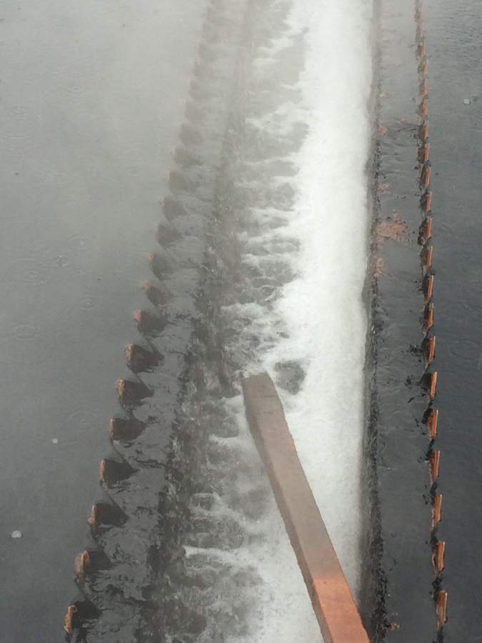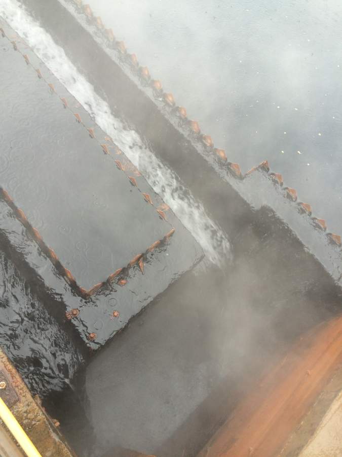 原水是棕色,加药采用硫酸亚铁和PAM,在反应区加药后出泥效果正常,水质清澈,PH在7左右,可是到了初沉池出水,颜色发黑,不透光。是这么回事。