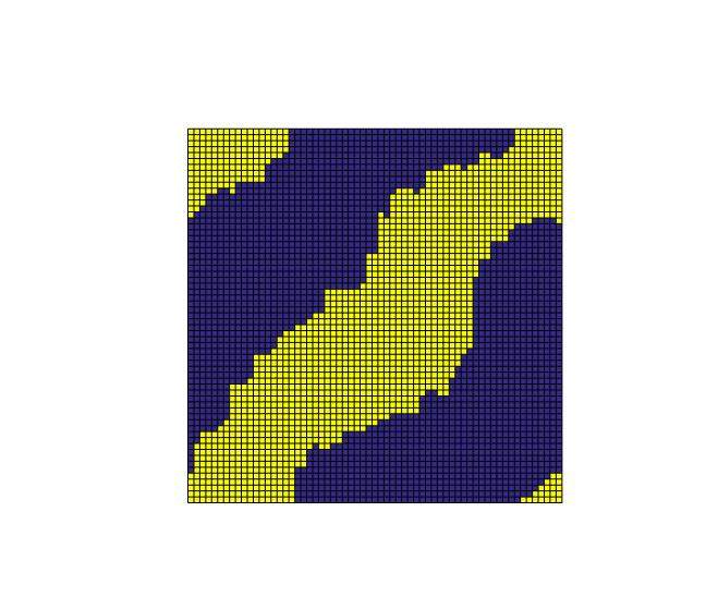 下面图1是H=0时(温度,能量)曲线,可以看到低温时有几个能量凸起的情况(比如T=0.7)。然后我查看了一下T=0.7时所有粒子的自旋构型,如下图2所示,黄色+1蓝色-1,还是很有规律的。模拟得到的临界温度在T=2.3左右,与理论解析解差异不大,另外,在有外场的情况下基本不会出现这种情况,所以我对程序的正确性还是有点信心的。