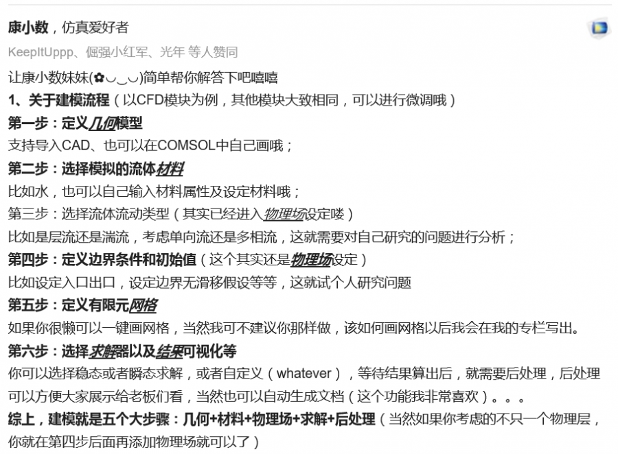 之前我用的是SolidWorks的flow simulation来进行流体仿真的,后来知道COMSOL更专业一些,就开始捣鼓COMSOL。无奈资料太少,学校图书馆里唯三的三本书还是2009年的。。。。求各位大牛指导COMSOL仿真入门。。。 在sw里,做流体仿真的话,步骤是 1,建模 2,打开flow simulation 3,创建封盖,使零件或者装配体形成封闭的空间 4,向导,在向导里选择单位制、流体、稳态/瞬态、重力场、表面粗糙度。完成后sw会自动找出计算域 5,边界条件,定义出入口。我一般是设置一个入口、流速,一个出口、环境压力。 6,目标,如流速、静压。右键,插入,再打几个钩就行了 7,网格,调节网格精细程度、设置最小缝隙。一般不用动,sw有默认的网格精度,自己会找出流域的最小缝隙 8,计算。点一下按钮等一段时间就行 9,分析结果 我装的是COMSOL5.2,现在知道选择模块、导入三维文件。然后,壁、流体属性、初始值这些项目下面的边界选择、激活、覆盖和贡献、边界条件表示完全不理解。和SolidWorks的思想貌似相差挺大的。COMSOL装了4天了,一个仿真都没做起来 ![]() 道理我都懂,主要是激活、覆盖和贡献、域、这些我不理解 如果想要做像前三张图片里那样的仿真,应该怎么操作,求详细说明,有个例子就最好啦 @wuming524 |