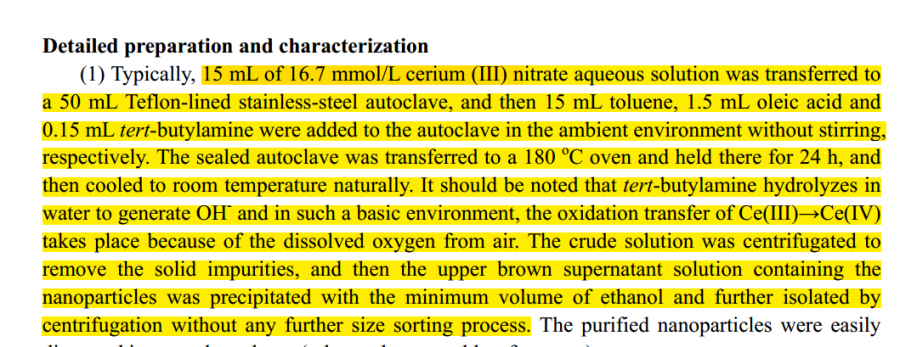 图一是制备的方法:用的是水热法,硝酸铈水溶液提供铈源,叔丁胺提供碱,油酸做分散剂,还有甲苯,作者通过调整Ce3+/油酸的摩尔比来调整颗粒粒径大小,但这里有点不明白,这里面的水相和有机相怎么作用的,甲苯的作用是什么,油酸的水溶性不好是怎么作用到纳米粒子上的?我刚刚接触这方面,希望各位大神不吝赐教,谢谢,原文附上 图1制备方法 |