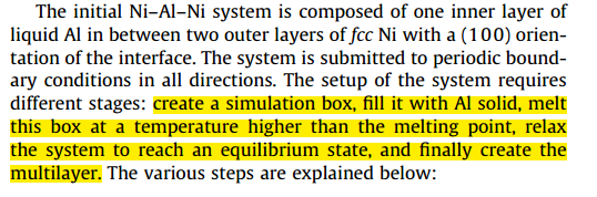 如下图所示,我在文献Dissolution process at solid/liquid interface in nanometric metallic multilayers: Molecular dynamics simulations versus diffusion modeling中看到这样的建模方法,先是把中间的合金加热至熔化,然后再加入旁边的两层镍,请问一下这个过程应该如何实现? 我是这样想的,加热至熔化后把合金的坐标输出(需要保存速度或者其它信息吗?),然后再整合镍的坐标,把新体系再代入计算,这样做是否合理? 1.png 2.png |