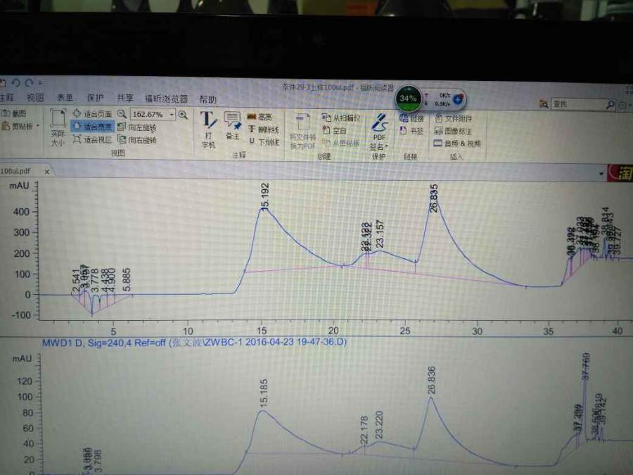 根据打氢谱看基本是肽类,但是大神帮我看看为啥拖尾成这样,这是第一次制备,第二次制备也做了分析为啥还是拖尾严重啊!用的是Eclipse XDB-C18柱,加了1%的甲酸。用等梯度更本不行,降低有机相峰直接被拉低而且拖尾更严重,大家有没有遇到这种现象, 条件: 0-20min 58-60%甲醇 20-22min60%的甲醇 23-32min68%的甲醇 33-45min100的甲醇 发自小木虫Android客户端 |