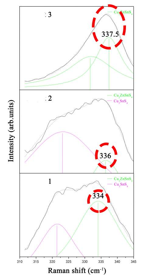 文献中介绍的CZTS的最强拉曼振动峰一般在333~337cm^(-1)范围内出现。 本姑凉做的CZTS粉体随着处理温度的提高,最强锋逐渐从333向337处移动。各位大侠帮忙看下什么原因或者怎样解释比较合理。 (1、2、3的处理温度逐渐升高,由于1、2的处理温度较低,其中出现了CTS等杂相) Raman对比图(局部放大图).jpg |