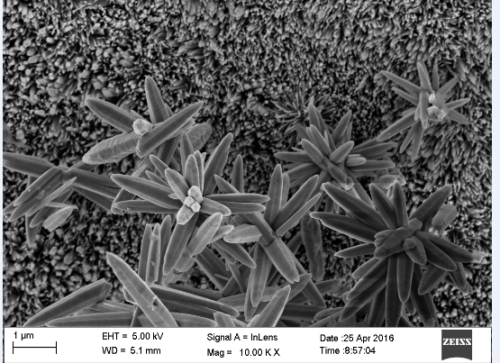 想制备棒状的氧化锌阵列,用的是氨水和醋酸锌生长氧化锌的。但随着反应进行,越来越多的花状氧化锌在棒状氧化锌上生长。花状和棒状的氧化锌是同时生长的吗?如何可以避免花状的生长?和溶液的浓度有关还是和反应时间温度有关呢? 70min 90min |
