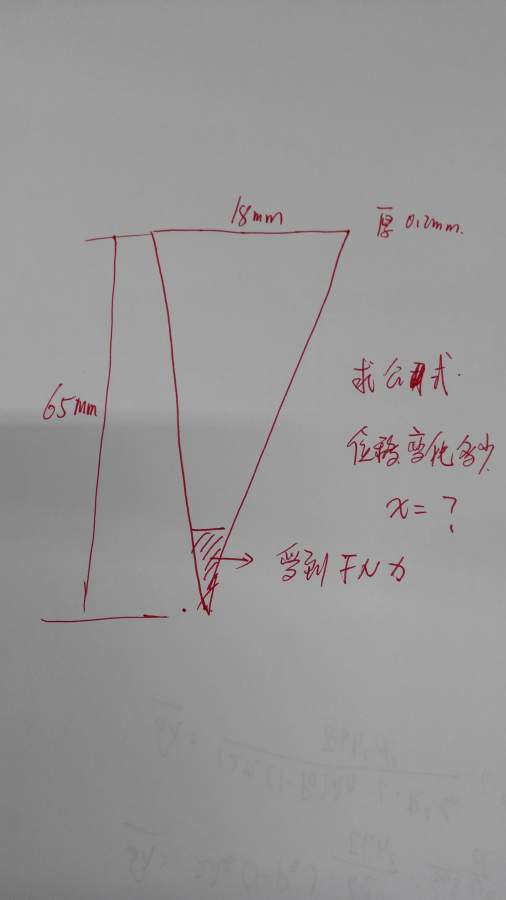 三角形等应变梁的长L为65mm 固定端宽18mm,厚度为0.2mm,当自由端受到F牛的力时,等应变量的位移变化