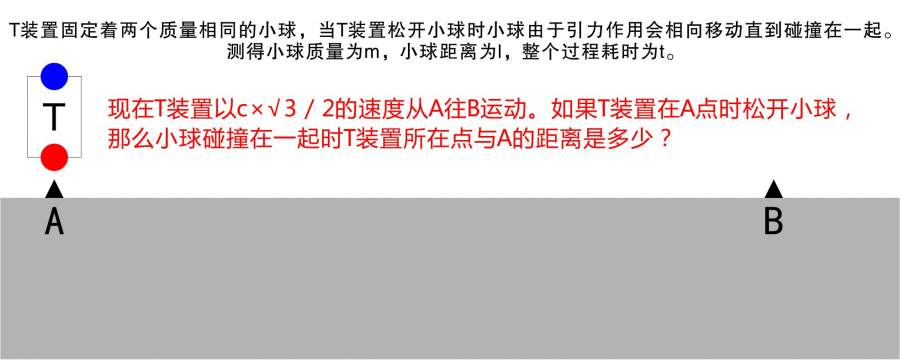 ![]() 如果在原参考系上用引力计算,小球引力质量不变(即引力不变),惯性质量为2m,距离为l,耗时为t×√2,与A点距离为ct×√6/2。 如果按相对论时间转换计算,T装置经历时间为t,原参考系经历时间为2t。则与A点距离为ct×√3。 |