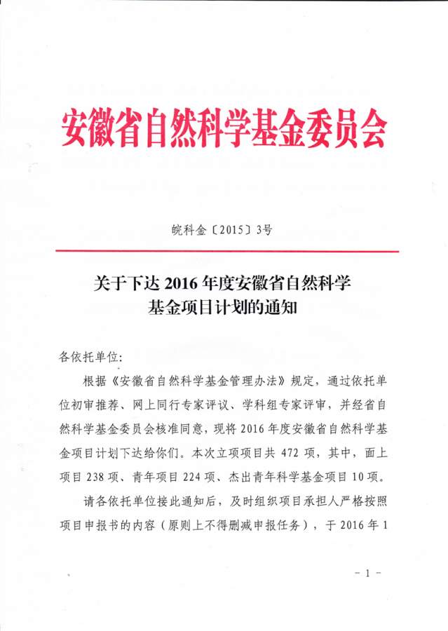 | 各位大虾,请问哪位手里有2016年度安徽省自然科学基金的正式批文,麻烦发虾米我一份,不甚感激! |