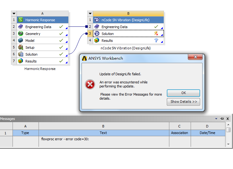 使用AnsysWorkbench14.5的nCode模块做一个简单的疲劳分析,按照书上的自己进行,但是在导入nCode过程中,出现Update of DesignLife failed(如图),不知道是哪里设置出现问题,望大神不吝赐教,先行谢过![]() Image 3.png |