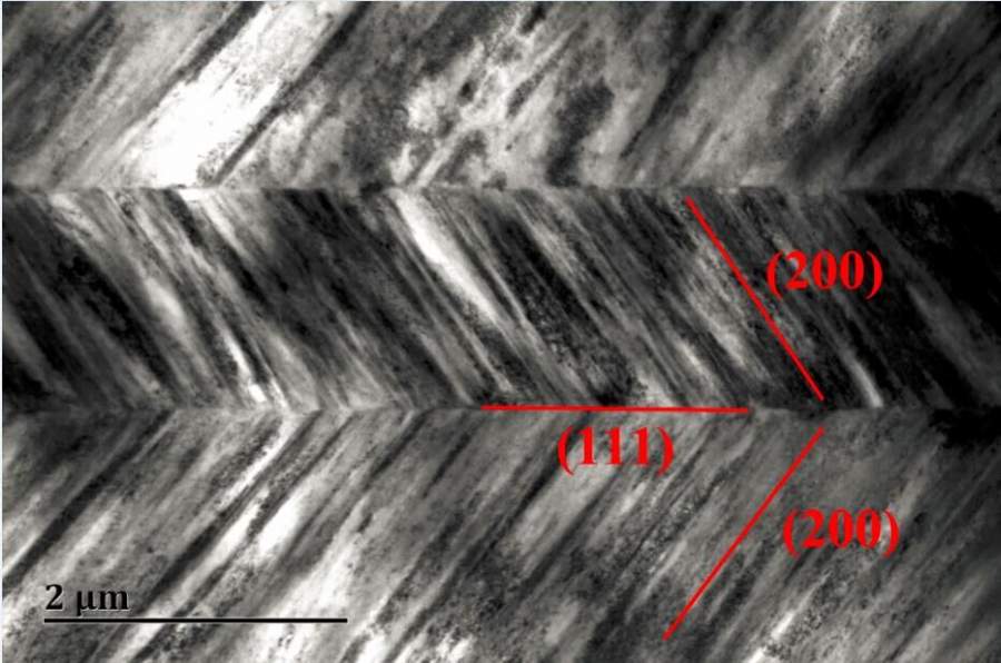 求助:麻烦大家帮我分析一下TEM明场相和相对应的HRTEM(fcc--FeCoCrNiMn-室温拉伸变形之后),中间的条带是退火孪晶,HRTEM:在孪晶和基体的界面处, 我想知道TEM明场相中平行于(200)面的条纹是什么? HRTEM.jpg TEM-BF.jpg |