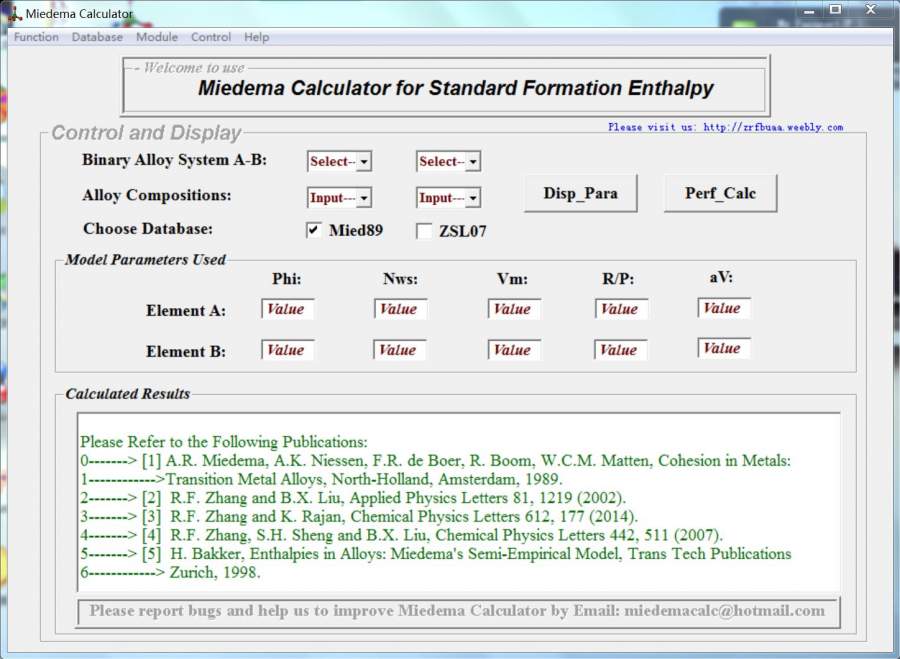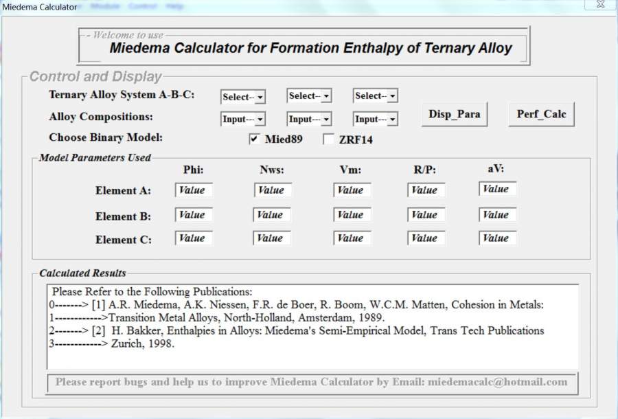 Miedema Calculator 4.0 (支持三元合金形成焓) 各种三元合金模型可供使用。 见如下链接: http://miedemacalc.weebly.com/ Main01.JPG Main00.JPG |